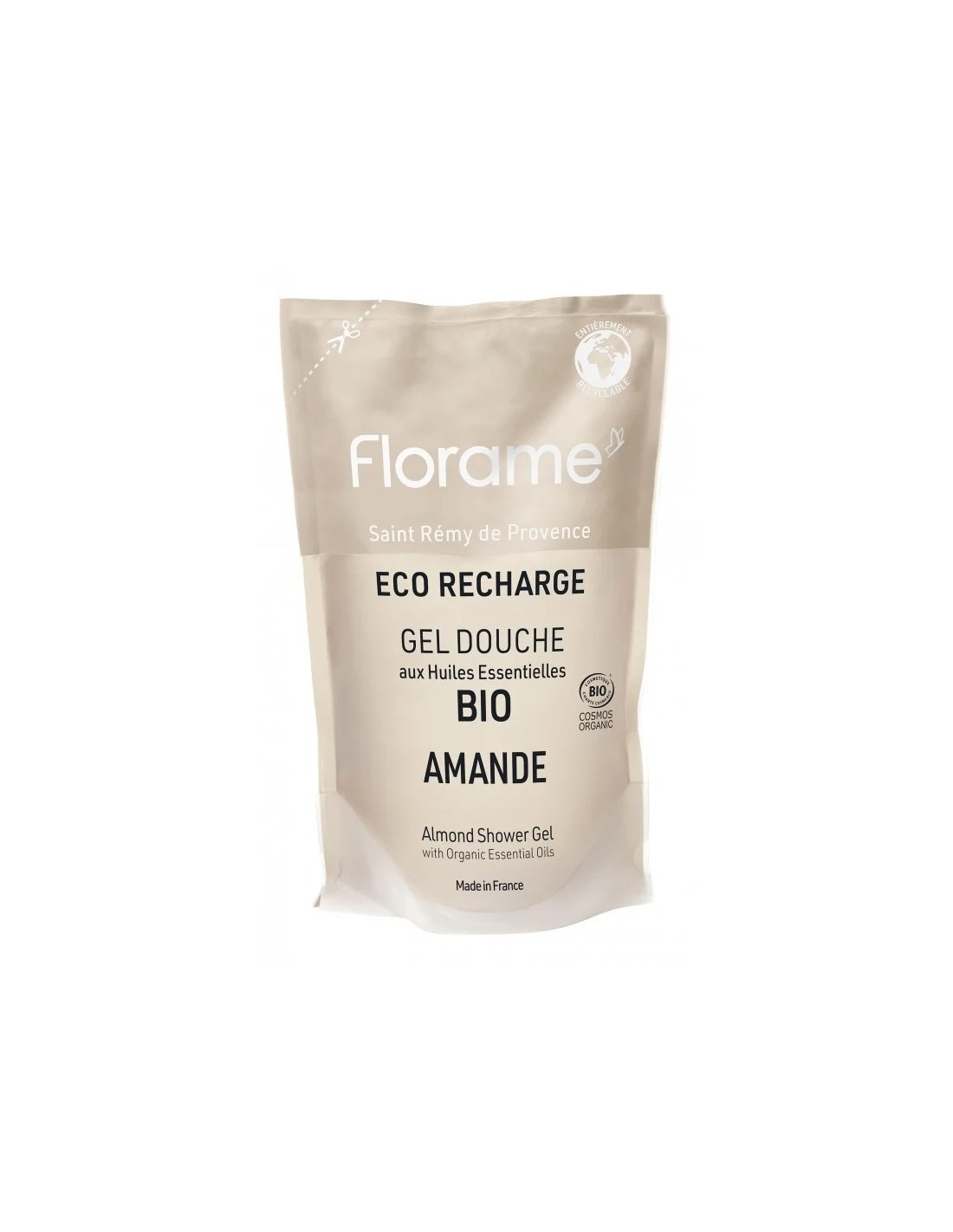 Eco-recarga gel de Ducha Amande de Florame, certificado orgánico, ofrece una textura en gel que, al contacto con el agua, se transforma en una espuma cremosa. Su fórmula suave limpia la piel respetando su equilibrio natural, aportando una sensación de bienestar y relajación.