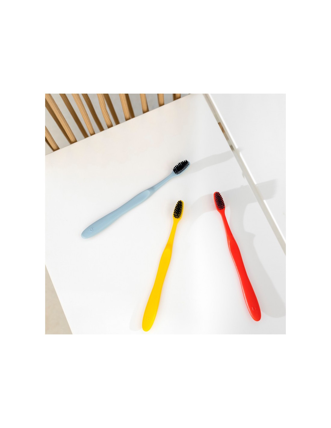 El cepillo de dientes representa solo una parte del ciclo de vida del plástico utilizado: de hecho, es material reciclado compatible con el contacto con los alimentos que forma el mango, y es reciclable después de su uso. Filamentos a base de plantas.