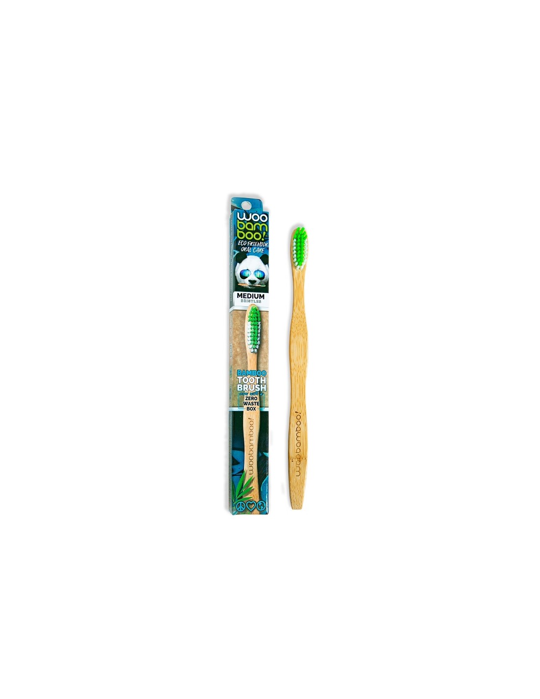 Todos los cepillos WooBamboo cuentan con un bonito mango ergonómico hecho de una sola pieza tallada de bambú Moso cultivado naturalmente y no contienen toxinas, pegamentos ni pinturas. Los mangos de los cepillos son naturalmente antimicrobianos y están recubiertos con una cera de soja natural, lo que los hace suaves y seguros para uso oral. Sus mangos son biodegradables y las cerdas son de alta calidad y grado dental, hechas de material reciclable . Toda la tinta utilizada en el packaging es a base de soja y el envase en sí está hecho de materiales reciclados que son reciclables.