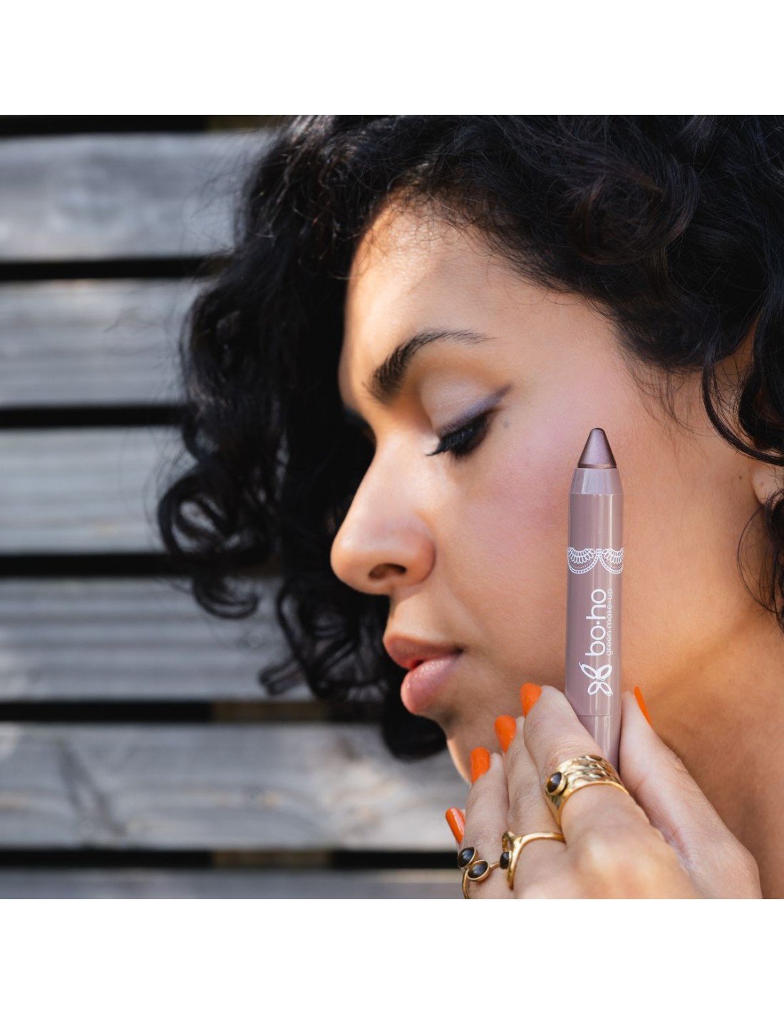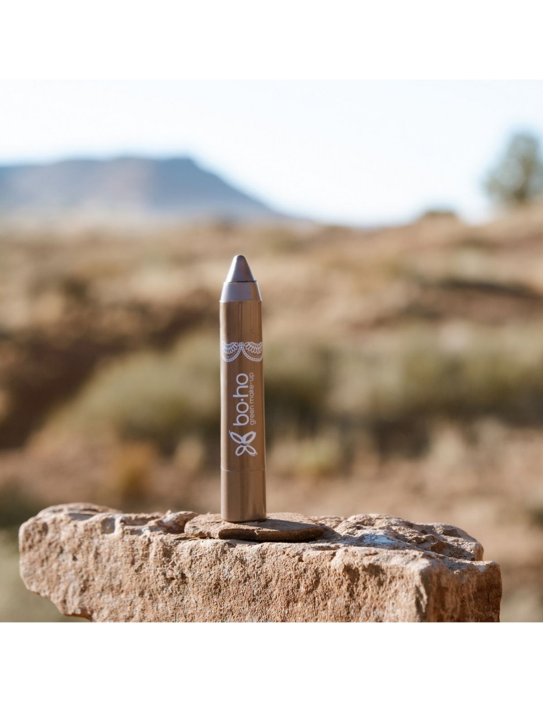 Aplica el lápiz directamente sobre el párpado en una línea fina con la punta o en todo el párpado, difuminando con el pincel 01, 03 o 09 de BOHO Green Make-Up.